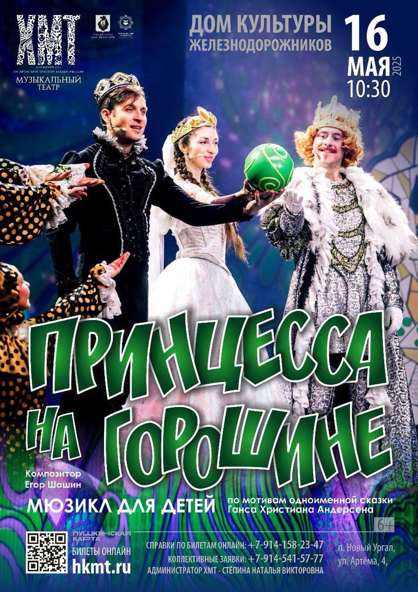 Мюзикл для детей «Принцесса на горошине» привезет Хабаровский музыкальный театр в п. Новый Ургал* ✨ 16 мая в 10:30 на сцене Дома культуры железнодорожников п. Новый Ургал, оживет любимая многими сказка Ганса Христиана Андерсена. 👸🏼 Эта семейная сага порадует юных зрителей красочными музыкальными номерами, а их родителей – увлекательным сюжетом о тонкостях отношений между поколениями. 🎟 Бронируйте билеты на сайте театра: https://hkmt.ru/performance/princessa-na-goroshine-g-novyj-urgal/ Коллективные заявки: Наталья Викторовна Стёпина (8 (914) 541-57-77).