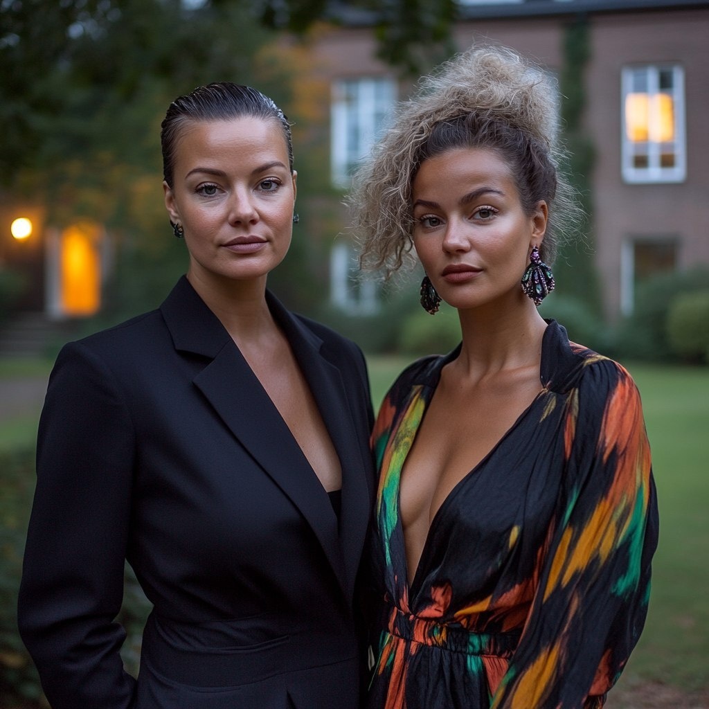 Создано на основе запроса: Two swedish sisters in their 30s, standing side by side. They are extremely different in style and personality. One is very formal: straight short hair, wearing a sharp black women's business suit, minimal makeup, serious expression. The other is bohemian: messy long hair, colorful and flowing clothes, plunging neckline, large artistic earrings, relaxed and warm smile. They are standing in front of a lit colonial-style mansion, early evening, moody sky, soft cinematic lighting. Hyperrealistic, candid moment, cinematic composition, shallow depth of field, 35mm photography style --- Автоперевод: Две шведские сестры в возрасте 30 лет, стоящие бок о бок. Как тебе иллюстрация? 🤔 https://dzen.ru/id/65c0c65c86e4f837c27b24d7 #ИИ #AI #нейросеть #midjourney #art