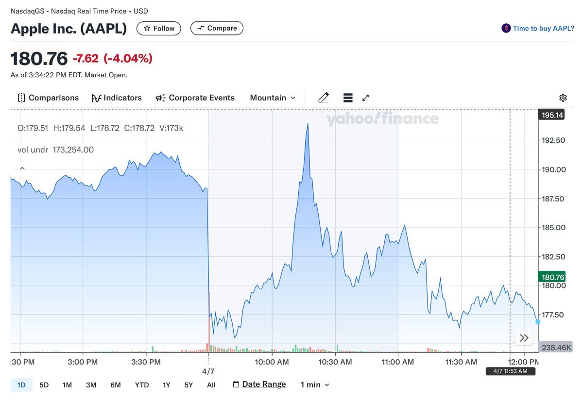 Акции Apple пережили в понедельник настоящие американские горки — всего за одно утро стоимость бумаг колебалась в диапазоне 17 долларов. Об этом сообщает информационное агентство Reuters. День начался с отметки 177,24 доллара за акцию, продолжая нисходящий тренд после того, как президент США Дональд Трамп анонсировал новые заградительные пошлины. Особенно болезненными они окажутся для Apple, которая все еще собирает большинство iPhone и других устройств в Китае — здесь пошлина достигнет 54% с 9 апреля. Похоже, мечты о «Сделано в США» становятся все ближе к реальности, хотя и не совсем так, как хотелось бы. Примерно через час торгов акции внезапно взлетели до 194,14 долларов на фоне слухов о том, что администрация Трампа рассматривает 90-дневную паузу в введении пошлин для всех стран, кроме Китая. Впрочем, представитель Белого дома быстро назвал эти сообщения «фейковыми новостями», после чего акции рухнули обратно ниже 180 долларов. На момент написания новости бумаги торгуются около о