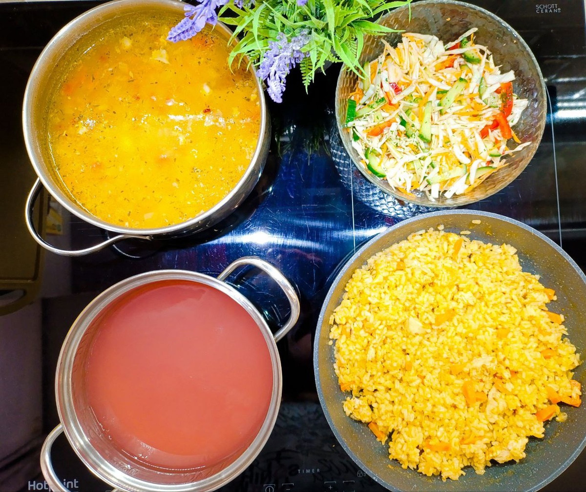 БЫСТРЫЙ ГАСТРОДЕНЬ🥬🍚🥘🥤 Бодрое утро меня сподвигло на включение турборежима мамы-повара. Одним ударом закрыла дневную готовку у плиты, чтобы вечером с мальчишками позаниматься. Планируем дыхательные практики и космические поделки😂 А вот что получилось с яствами на сегодня😉 🥬Салат из свежей капусты, огурцов и перца Лето не за горами, а мне еще худеть и худеть! Поэтому салат из капусты, огурцов и перца – мой верный друг на пути к фигуре мечты!😂 Опять же витамины нужны. Все режете произвольно, добавляете зелени, немного растительного масла, соли, лимонного сока😊 🍚Плов с куриным филе Выручает, когда нет времени на долгие готовки. Быстрый, простой и очень вкусный рецепт, который под силу даже начинающим кулинарам! Ингредиенты: • Куриное филе - 250 г • Рис - 1 стакан • Морковь - 1 шт. • Лук - 1 шт. • Растительное масло - 2 ст.л. • Вода - 2 стакана • Соль, перец, специи для плова - по вкусу Приготовление: 1. Куриное филе нарезать кубиками. 2. Морковь натереть на крупной