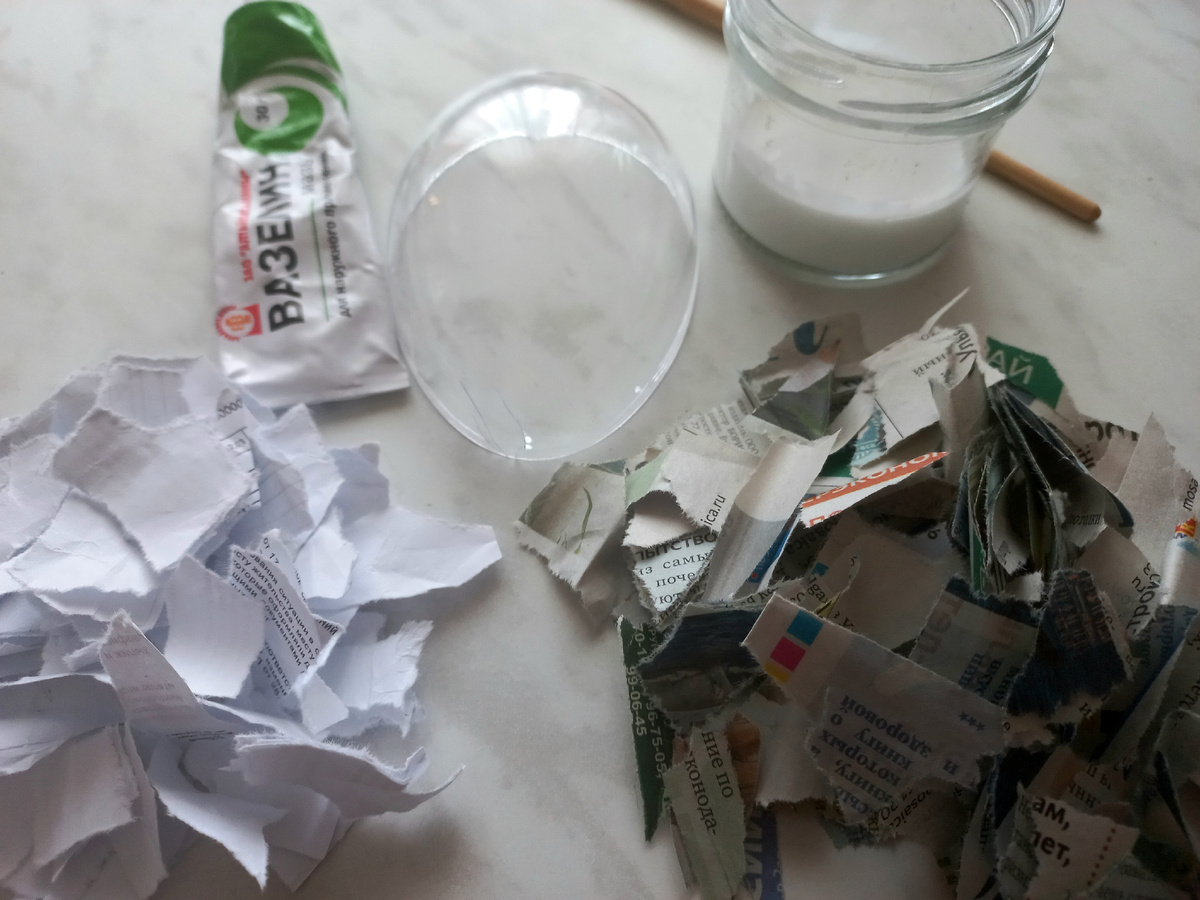 Что надо: газету порвать на кусочки, бумагу офисную тоже, клей ПВА с водой развести и , важно, нужен вазелин. Вазелином я смазала поверхность бракованной скорлупы. Теперь нужно кусочки газеты приклеивать на скорлупу. Первый слой, конечно, еще то испытание. Кто умеет материться, тому легче. Нет - научитесь.))) Второй слой клеим бумагой, это уже легче. И так чередуем слои три раза. Отложим в сторону и дадим хорошо высохнуть.