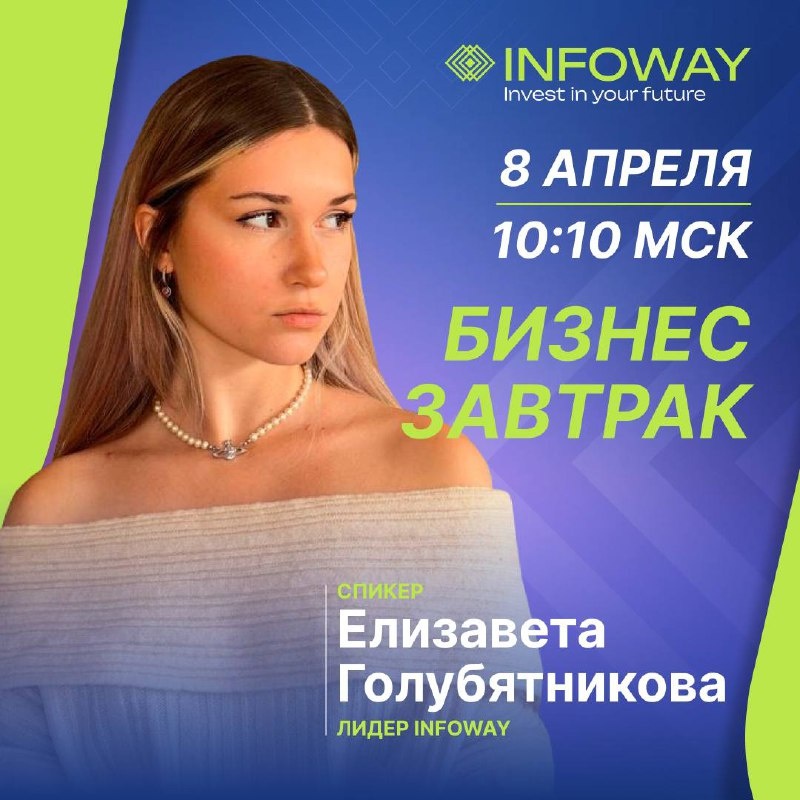 Не пропустите важное напоминание! 🚀Уважаемые друзья, приглашаем вас на бизнес-завтрак 📅 8 апреля в 10:10 (по МСК)! В этот раз нашим спикером выступает 💼 Елизавета Голубятникова — самый молодой партнер компании! Ей всего 18 лет! Елизавета поделится своим уникальным видением бизнеса и расскажет, как Infoway изменил ее взгляды на мир финансов и инвестиций! Присоединяйтесь к нам, чтобы зарядиться мотивацией на весь день! 🎯 До встречи на бизнес-завтраке!