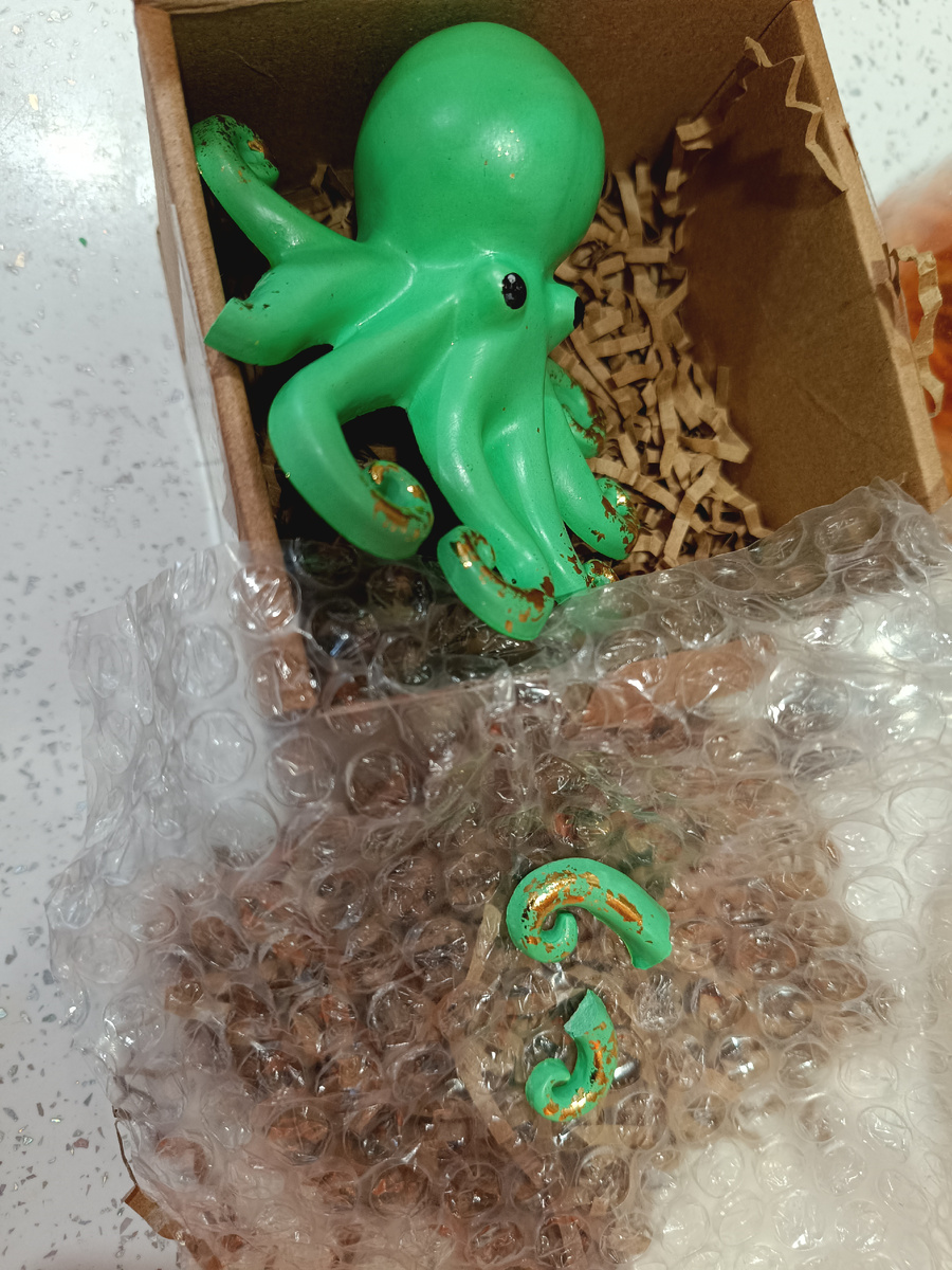 Честно, было обидно. И не только за то, что фигурка сломана, но вообще не такая по цвету, как показано было в карточке товара. В карточке был красивый оливковый осьминог, а прислали какого-то непонятного ярко-зеленого цвета.