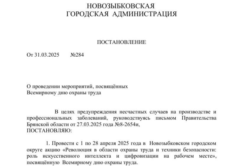 Не апрельская шутка. Принято официальное постановление о проведении с 1 по 28 апреля в Новозыбковском городском округе акции «Революция в области охраны труда и техники безопасности…». А все для чего? Для предупреждения несчастных случаев на производстве и профессиональных заболеваний. Инициатива не местная, сослались на письмо Правительства Брянской области от 27.03.2025 года №8-2654и. Само содержание плана мероприятий далеко не революционно и «попахивает» устаревшими с советских времен распоряжениями. Например, из «инноваций» запланирована работа «Горячей линии», проведение информационных часов (в форме собраний, совещаний),. Да, еще из далеко не революционного, оформление уголка и стенда, посвященных Дню охраны труда. Так, что, товарищи! Революция не отменяется! ПОДРОБНЕЕ: https://bryansknovosti.ru/администрация-новозыбкова-приняла-р/