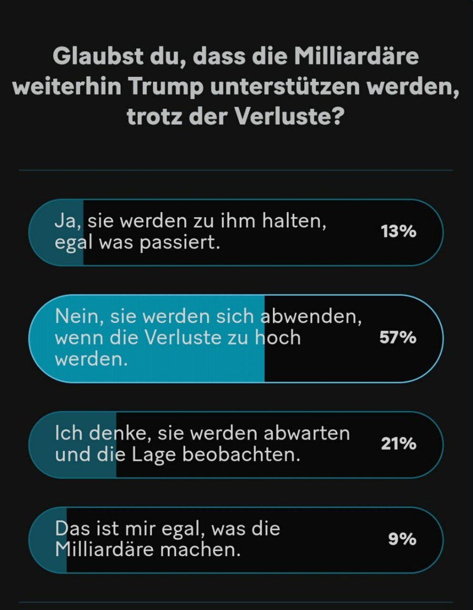 👀 Мда.. Шо эксперты, шо читатели : Как вы думаете, будут ли миллиардеры продолжать поддерживать Трампа, несмотря на потери? Да, они будут поддерживать его, несмотря ни на что - 13% Нет, они отвернутся, если потери станут слишком большими - 57 % Я думаю, они подождут и посмотрят - 21% Мне все равно, что делают миллиардеры - 9% #Швейцария