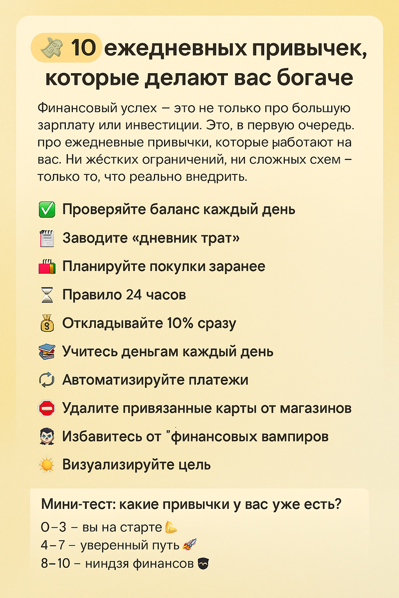 Это как смотреть в зеркало — просто сохраняйте контакт с реальностью. Так легче избежать лишних трат и сосредоточиться на цели. 🧠 Пример: вы видите, что на карте осталось 2 300 ₽, и автоматически отменяете ненужную доставку суши на вечер. Записывайте всё, даже кофе на бегу. Приложение, заметка, голосовой ввод — как удобно. Через неделю вы поймёте, где утекают деньги. Ощущения после анализа: «Серьёзно, я потратил 7000 рублей на перекусы?» Список — это защита от спонтанных трат. И в магазине, и в интернете. В списке нет — в корзину не попадает. Хочется купить? Подождите сутки. Обычно желание проходит, а деньги остаются. Особенно полезно в «Чёрную пятницу» и на маркетплейсах 🌚 Как только деньги придут — отправьте часть себе. Не ждите, что что-то останется в конце месяца. Принцип: “Плати сначала себе — остальным потом.” Одна статья, короткое видео, подкаст — 5 минут в день. 📲 Подпишитесь на финансовые каналы, чтобы знание шло к вам само. Коммуналка, кредит, накопления — пусть вс