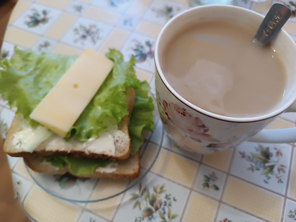 Приветствую всех на своем канале. Как же сегодня холодно на улице, даже снег немного посыпал утром. Бррр, совсем уже не хочется такой холодины. Но , вспомним песню в исполнении несравненной Алисы Фрейндлих " У природы нет плохой погоды " и весело шагаем на работу 😉. Вчера я переживала , что могу простудиться, так как на работе первую половину дня было очень холодно. И ведь всё таки горло моё сегодня целый день болит. Лечу его всеми доступными средствами. Надеюсь удастся не разболеться. Завтра иду к врачу за разрешением на лечение у другого врача. Запись поймать я не смогла, в ближайшие две недели это просто не реально. А так как получить это самое разрешение мне нужно срочно, то пойду без записи и буду надеяться на удачу и помощь ангела хранителя. И вы, мои уважаемые подписчики, пожелайте , пожалуйста мне удачи 🙏 Кофе, хлеб отрубной , сыр творожный с вялеными томатами , листья салата и сыр Маасдам. Всё чётко - делю штучку на пополам. Скучаю по подружке (очень очень), поэтому когда