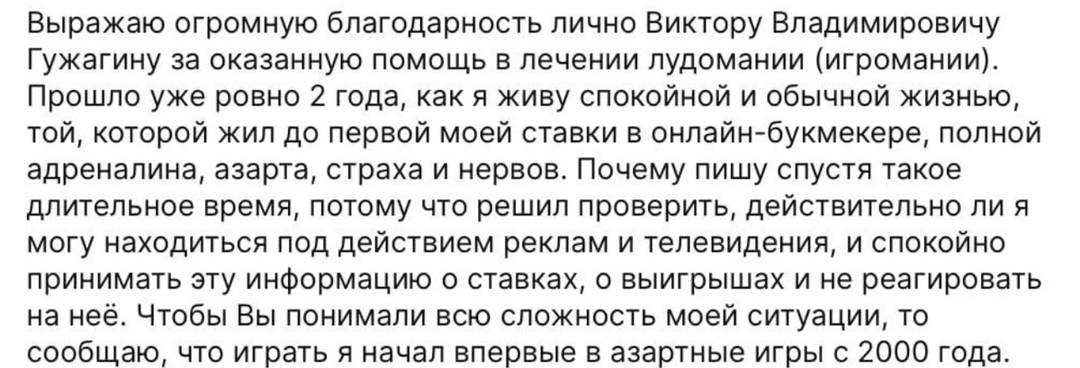 Эта статья для тех, кто ищет помощь: как избавиться от лудомании, как справиться с игровой зависимостью, как преодолеть зависимость от ставок. Если вы нашли эту статью, значит, вы уже на пути к решению вашей проблемы. Не откладывайте, звоните или пишите прямо сейчас, контакты в канале https://t.me/drguzhaginv. Ваше будущее в ваших руках.