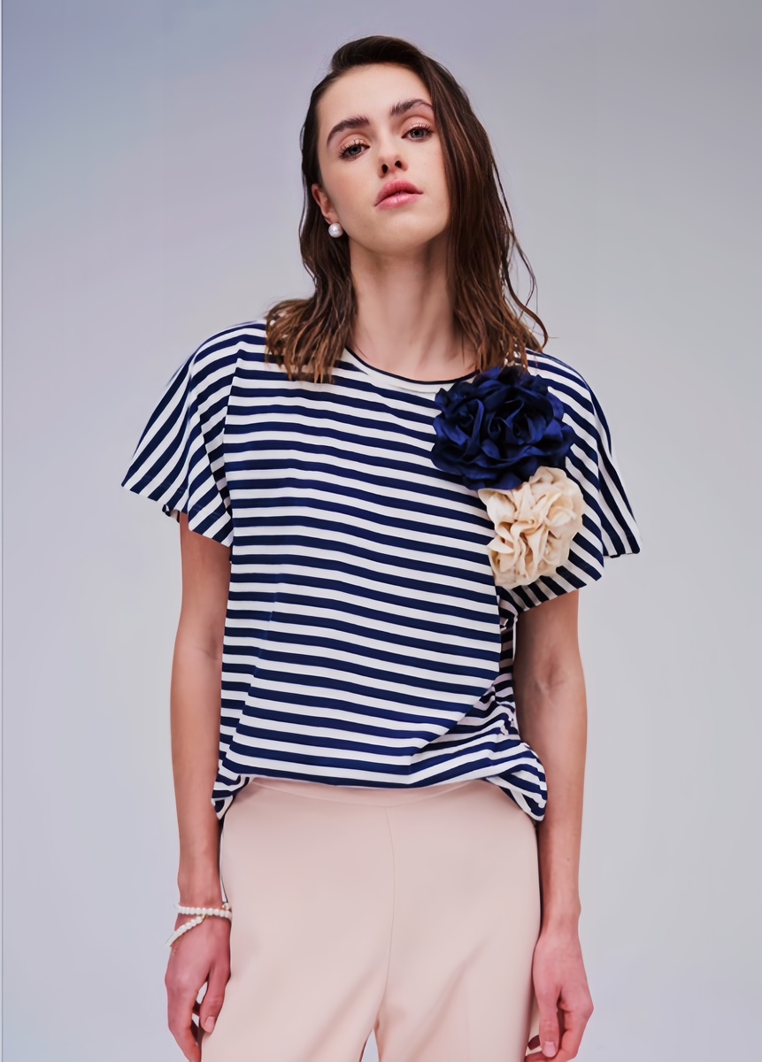 Весна — это всегда немного про свободу. Свободу от тяжёлых тканей, навязанных правил и чужих ожиданий. И именно одежда помогает эту свободу прочувствовать первой. Мы собрали три образа, каждый из которых работает на своё настроение — от лёгкости утренней прогулки до городской интеллектуальности с цветочной ноткой. Давайте разберёмся вместе, как их носить — и зачем. Полоска — вечная классика, но здесь она получает новое звучание. Свободная футболка в бело-синюю полоску превращается из базовой в выразительную за счёт объёмных цветов на плече. Контрастные, почти театральные — они создают акцент и задают настроение всему образу. Это вещь для тех, кто не хочет быть «громкой», но хочет быть замеченной. Идеальна и в паре с джинсами, и с лёгкой юбкой в отпускной чемодан. Свободный трикотаж в полоску, длинная юбка в пол, лёгкая небрежность и шарф на шее. Этот образ будто сошёл с улиц Милана или Рима — расслабленный, но с характером. Без нарочитости, без перегруза. Он по
