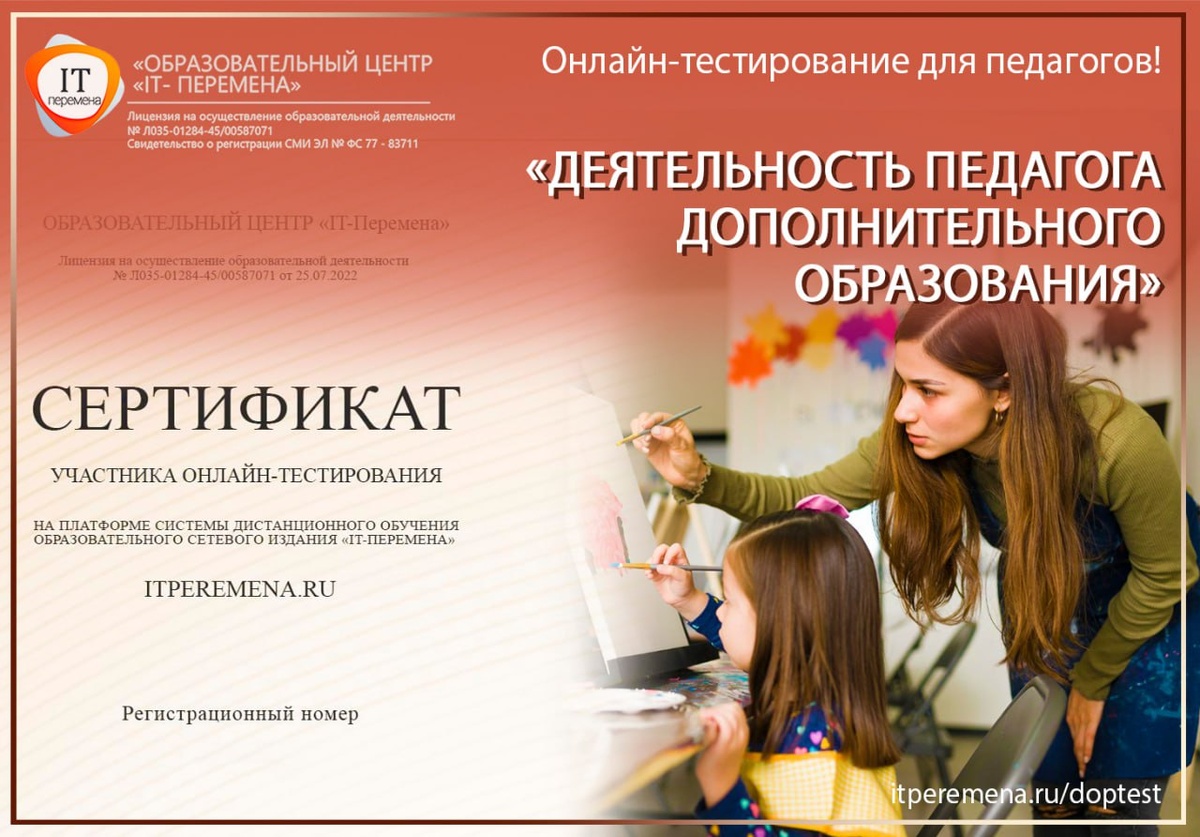 Квалификационное онлайн-тестирование для педагогов! Очередная тема – «Деятельность педагога дополнительного образования». Тестирование можно пройти прямо на нашем сайте https://itperemena.ru/doptest, без дополнительной регистрации. Попробуйте и проверьте свои знания бесплатно!