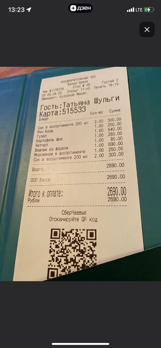 Действительно, сок посчитали не два раза как положено, а четыре!!! В верхней строчке и нижней . Только что делать с этой информацией ? Опять идти в «Бахор» и предъявлять претензии? Или тщательнее проверять счет в следующий раз?