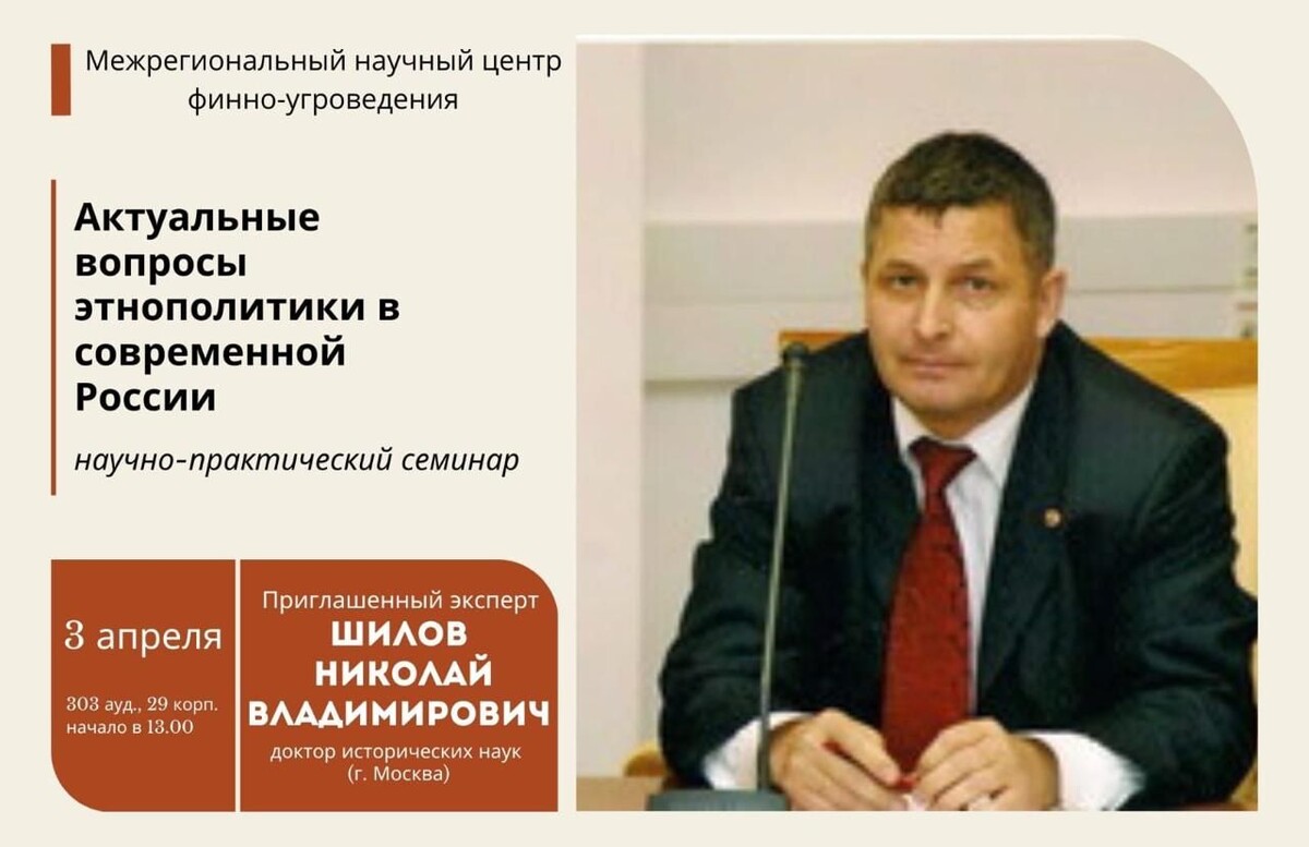03 апреля 2025 г. в Межрегиональном научном центре финно-угроведения Мордовского государственного университета им. Н. П. Огарева (директор, кандидат юридических наук, доцент Немечкин Василий Николаевич) состоялся научно-практический семинар, который провел доктор исторических наук, профессор кафедры социально-гуманитарных дисциплин и менеджмента Московского социально-педагогического института, Член Правления Региональной общественной организации "Обьединение финно-угорских народов г. Москвы" Николай Владимирович Шилов. На мероприятии присутствовали студенты, магистранты и аспиранты университета, а также Начальник отдела по вопросам межнациональных отношений министерства культуры, архивного дела и национальной политики Республики Мордовия,кандидат юридических наук Стенькин Даниил Сергеевич. Разговор шел об актуальных вопросах этнополитики в современной России, о важности противостояния различным вызовам и рискам, связанным с предотвращением эрозии национального единства россиян,