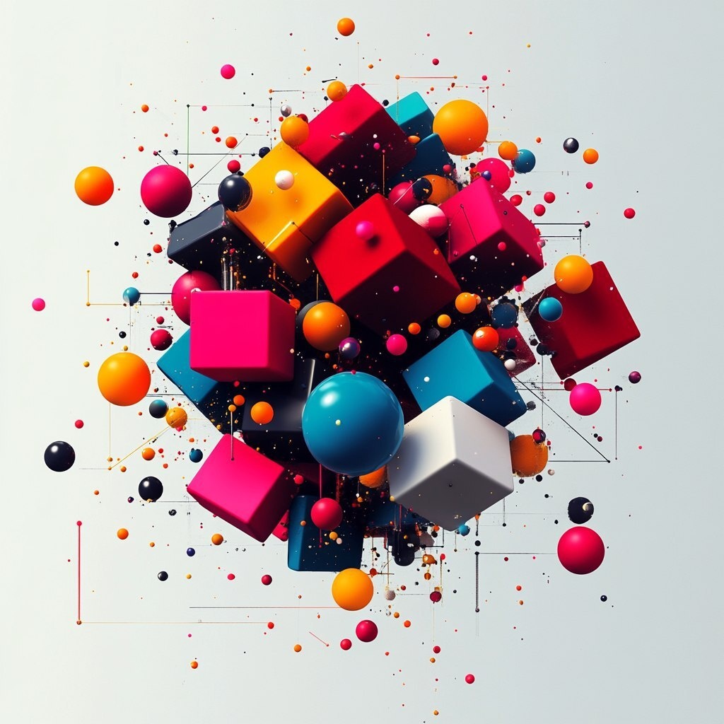 Создано на основе запроса: Abstract composition of multicolored cubes and spheres