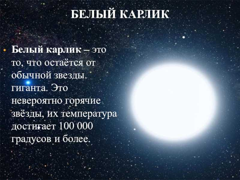 Белые карлики — это ядра звезд, подобных Солнцу, сгоревших и сжавшихся до размеров Земли, но невероятно плотных.