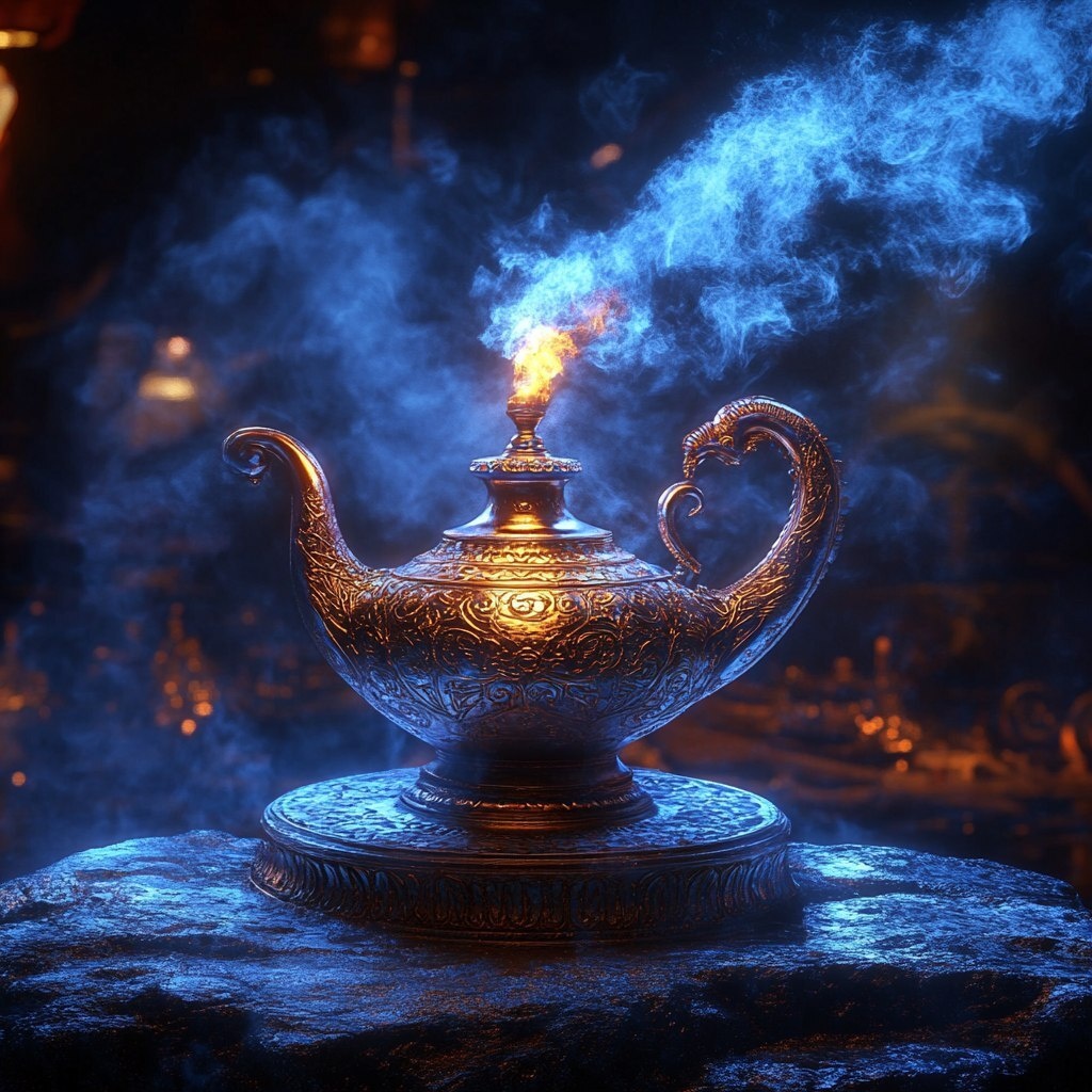 Создано на основе запроса: Aladdin’s magical lamp resting on an ancient stone pedestal, glowing with a mystical golden light, surrounded by swirling blue smoke, intricate Arabic patterns engraved on the lamp, ultra-realistic, 4K, highly detailed