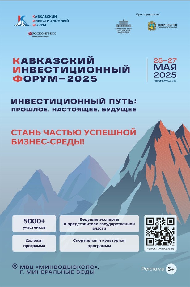 🔥 Кавказский инвестиционный форум уже скоро в Минеральных Водах! 💪 С 25 по 27 мая 2025 года в «МинводыЭКСПО» пройдет крупнейший инвестиционный форум КИФ-2025, который соберет лидеров государственного и корпоративного сектора, экспертов и представителей СМИ. Организатором форума выступает Фонд Росконгресс при поддержке Правительства РФ и Министерства экономического развития России. За годы своего существования КИФ зарекомендовал себя как ведущая деловая, экспертная и выставочная платформа России, способствующая развитию взаимовыгодных отношений между властью, бизнесом и экспертным сообществом. В рамках форума КИФ-2024 состоялось 65 деловых мероприятий, в которых приняли участие около 430 спикеров и 4 тысячи делегатов, включая представителей федеральных и региональных органов власти, бизнесменов, экспертов и журналистов ведущих международных СМИ из 33 стран. Это продемонстрировало высокий интерес к форуму и огромный инвестиционный потенциал СКФО. По итогам КИФ-2024 было подписано 100