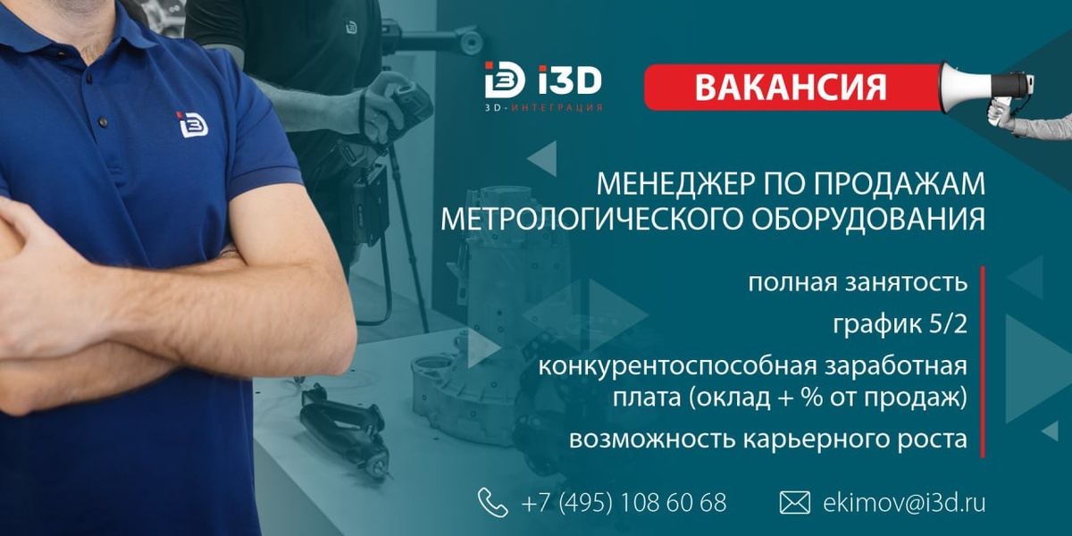 ВАКАНСИЯ - МЕНЕДЖЕР ПО ПРОДАЖАМ МЕТРОЛОГИЧЕСКОГО ОБОРУДОВАНИЯ i3D – ведущий поставщик решений в области метрологии и 3D-сканирования. Мы предоставляем инновационные технологии для измерений, контроля качества и инженерных разработок в различных отраслях – от автомобилестроения до медицины. В данный момент мы расширяем нашу команду и находимся в поисках менеджера по продажам метрологического оборудования. Ключевые задачи: - Активный поиск и привлечение новых клиентов, развитие существующей клиентской базы - Проведение переговоров, презентаций и демонстраций оборудования - Подбор метрологических решений под задачи клиентов - Подготовка коммерческих предложений и заключение договоров - Взаимодействие с техническими специалистами и производителями оборудования - Участие в выставках, конференциях и профильных мероприятиях - Контроль выполнения заказов и сопровождение клиентов на всех этапах сотрудничества Наши ожидания: - Развитые навыки ведения переговоров и презентаций - Умение работат