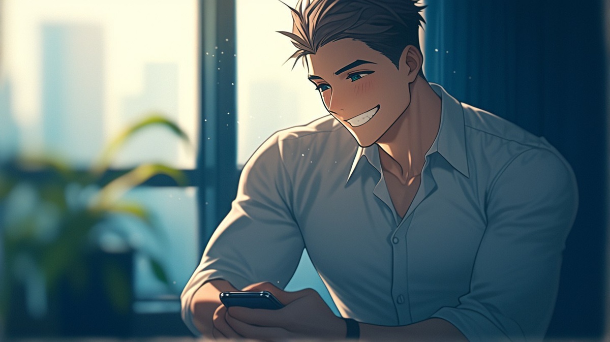 Создано на основе запроса: Close-up of a Japanese man holding a smartphone in one hand, smiling contentedly and looking at the screen with a