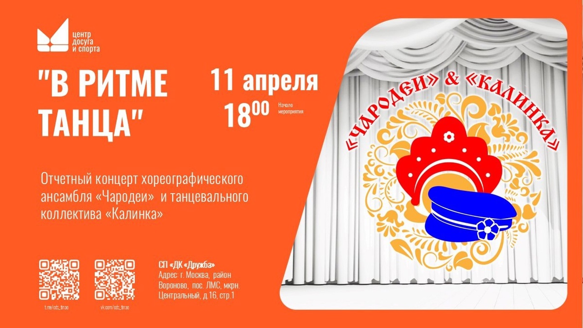 💃🕺 "Чародеи" и "Калинка" приглашают на отчётный концерт!💃🕺 11 апреля в 18:00 в ДК "Дружба" состоится яркое и красочное представление – отчётный концерт хореографического ансамбля "Чародеи" и танцевального коллектива "Калинка"! Вас ждут захватывающие танцевальные номера и незабываемые впечатления! Ждём вас!
