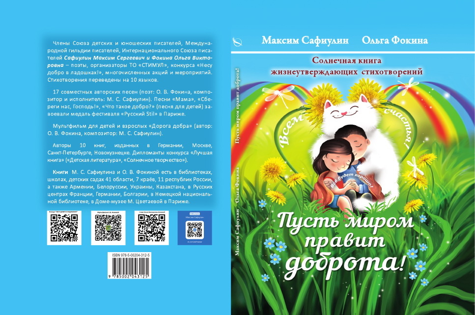 Авторы солнечной книги жизнеутверждающих стихотворений «ПУСТЬ МИРОМ ПРАВИТ ДОБРОТА!»: Максим Сергеевич Сафиулин и Ольга Викторовна Фокина (Усть-Илимск). Издано в 2022 г. в Москве, 108 с. ISBN 978-5-00204-312-5