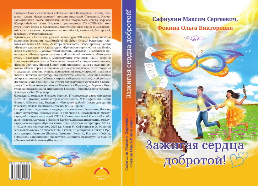 Авторы книги «ЗАЖИГАЯ СЕРДЦА ДОБРОТОЙ!»: Максим Сергеевич Сафиулин и Ольга Викторовна Фокина (Усть-Илимск). Издано в 2020 г. в издательстве «У Никитских ворот» (г. Москва), 492 с. ISBN 978-5-00170-219-1
