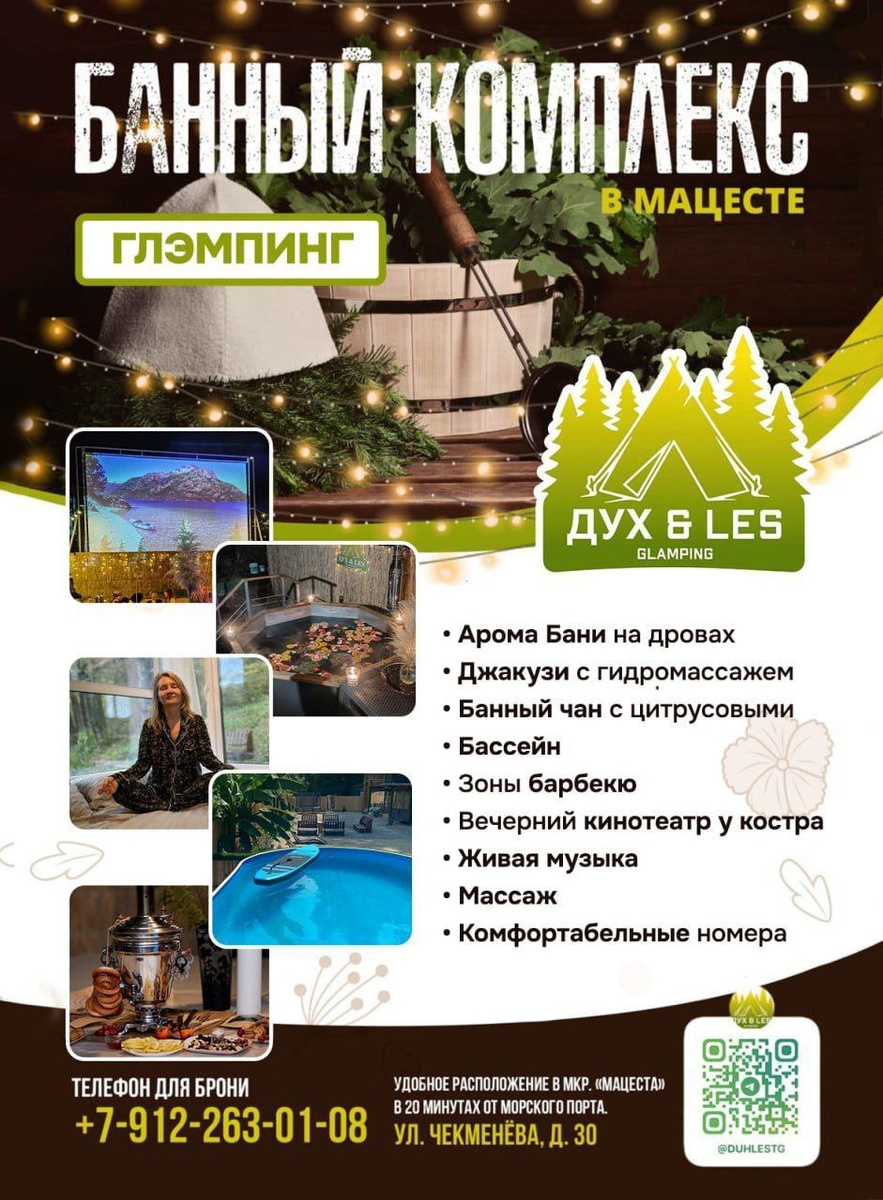 Баня, бассейн, банный чан, терраса, зона барбекю, костер, кинотеатр под открытым небом, живая музыка, комфортабельные номера, красивые виды.