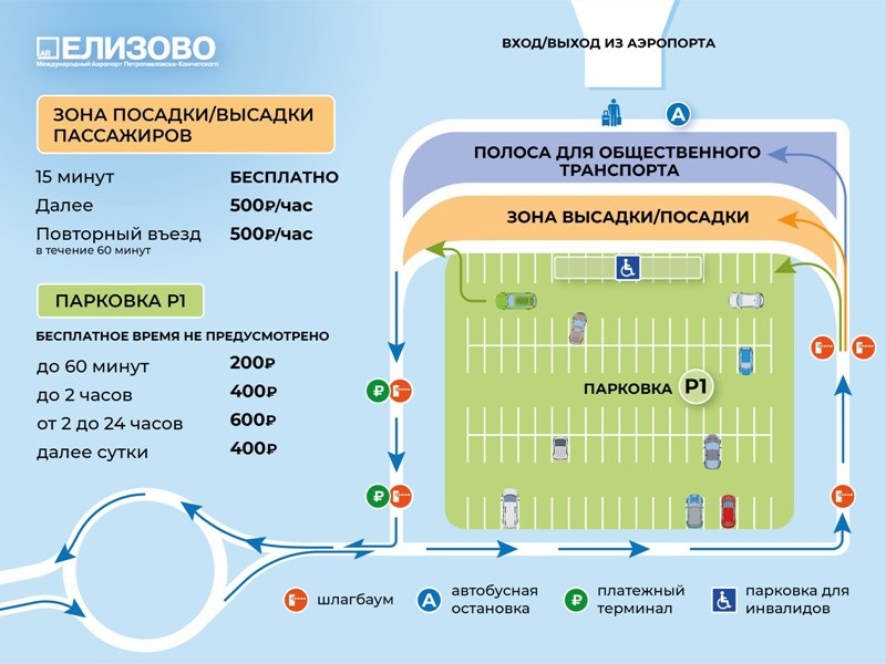 📌 В аэропорту Елизово заработал парковочный комплекс На привокзальной площади нового терминала аэропорта Петропавловск-Камчатский (Елизово) заработал парковочный комплекс, сообщили РАИ «КАМЧАТКА-ИНФОРМ» в пресс-службе аэропорта. Для водителей, которые не планируют длительное пребывание на территории аэропорта, организована зона посадки (высадки) пассажиров. Она предназначена для быстрой посадки и высадки вблизи обособленной входной группы аэропорта. Заезд осуществляется после получения парковочного талона через правую въездную стойку по выделенной полосе. Бесплатное время пребывания составляет 15 минут. При превышении лимита применяется тариф в размере 500 рублей в час. Если нужно оставить автомобиль на привокзальной площади на более долгий срок, следует воспользоваться парковкой Р1, въезд ... Читать на сайте: https://kamchatinfo.com/news/kolhoz/detail/69298/