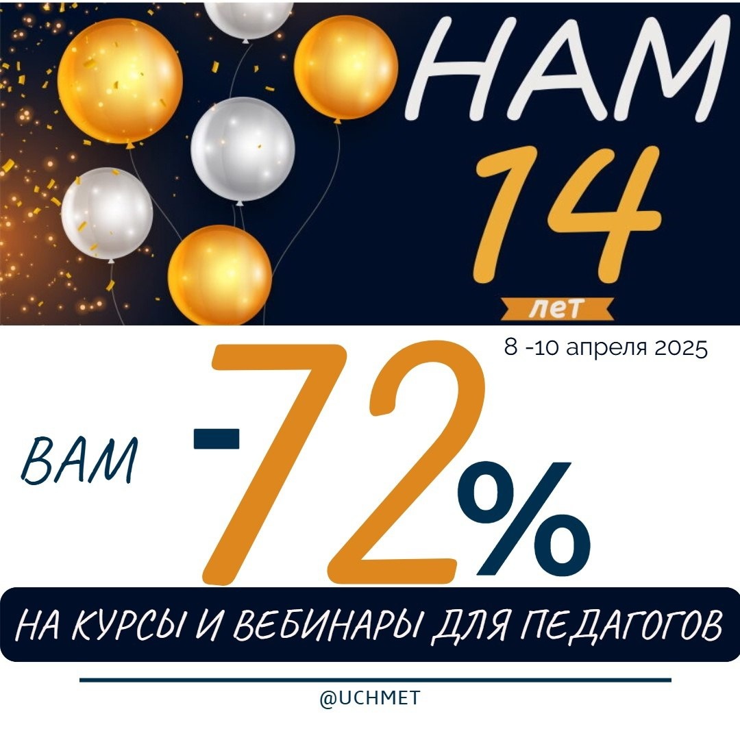 В этом году порталу «УчМет» исполняется 14 лет! На протяжении всех этих лет мы с радостью помогаем учиться и развиваться нашим коллегам и друзьям — педагогам из самых разных организаций. В честь дня рождения портала с 8 по 10 апреля 2025 года мы подготовили специальный подарок — скидку 72% на любые программы переподготовки, курсы повышения квалификации или вебинары. Не упустите возможность воспользоваться этим предложением! https://www.uchmet.ru/campaigns/3854486/ #акция #учмет #даримСкидку #курсы #вебинары