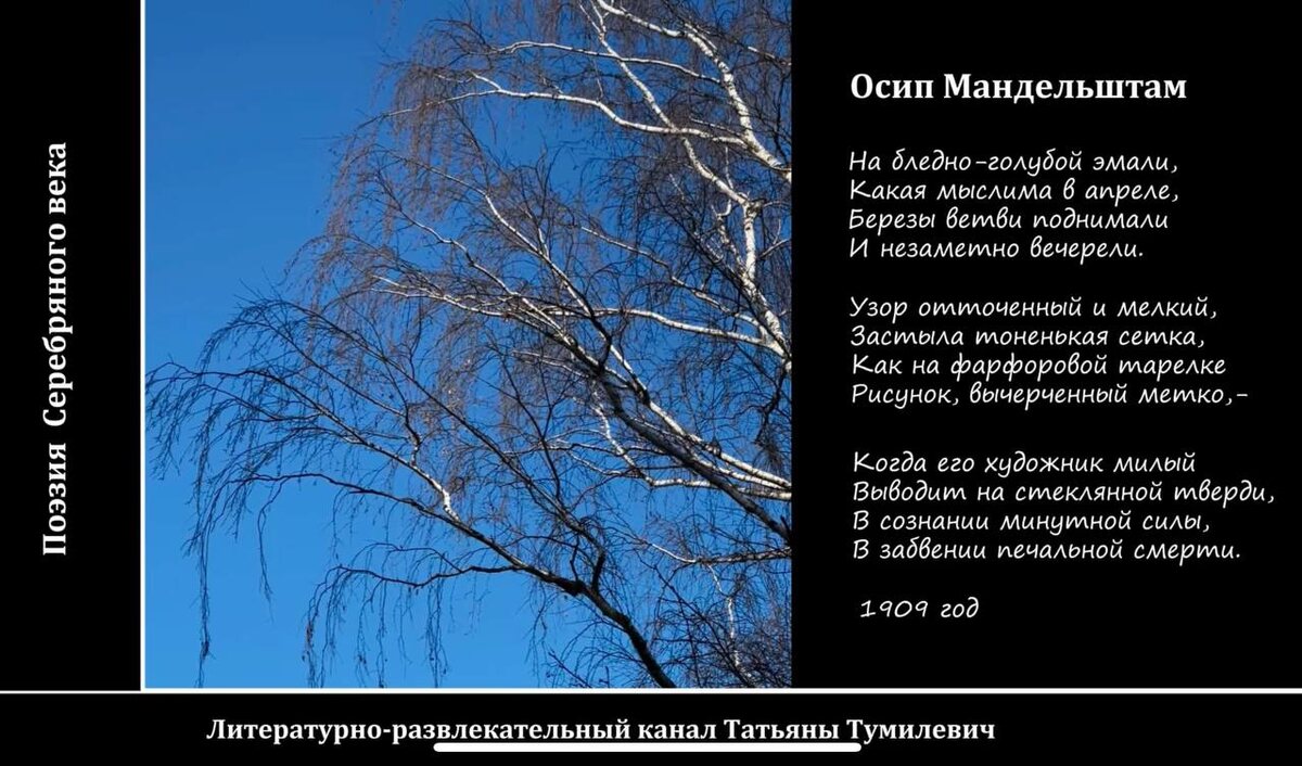 Осип Эмильевич Мандельштам (1891–1938) — выдающийся русский поэт, один из крупнейших представителей акмеизма, литературного течения начала XX века. Его творчество отличается глубиной, яркостью образов и философскими смыслами. Это ранняя лирика Осипа Мандельштама, стихотворение "На бледно-голубой эмали", написанное в 1909 году. Стих показывает красоту весеннего мира, когда небесный художник не поскупился на краски и показал природу во всем ее великолепии. На бледно-голубой эмали, Какая мыслима в апреле, Березы ветви поднимали И незаметно вечерели. Узор отточенный и мелкий, Застыла тоненькая сетка, Как на фарфоровой тарелке Рисунок, вычерченный метко, — Когда его художник милый Выводит на стеклянной тверди, В сознании минутной силы, В забвении печальной смерти. 1909 год Некоторые этапы творчества Мандельштама: Главные темы творчества: жизнь и смерть, Античность, связь культуры, истории и современности, тема творчества, мироощущение человека вне времени, любовь, Петербург. Осип Мандельшт