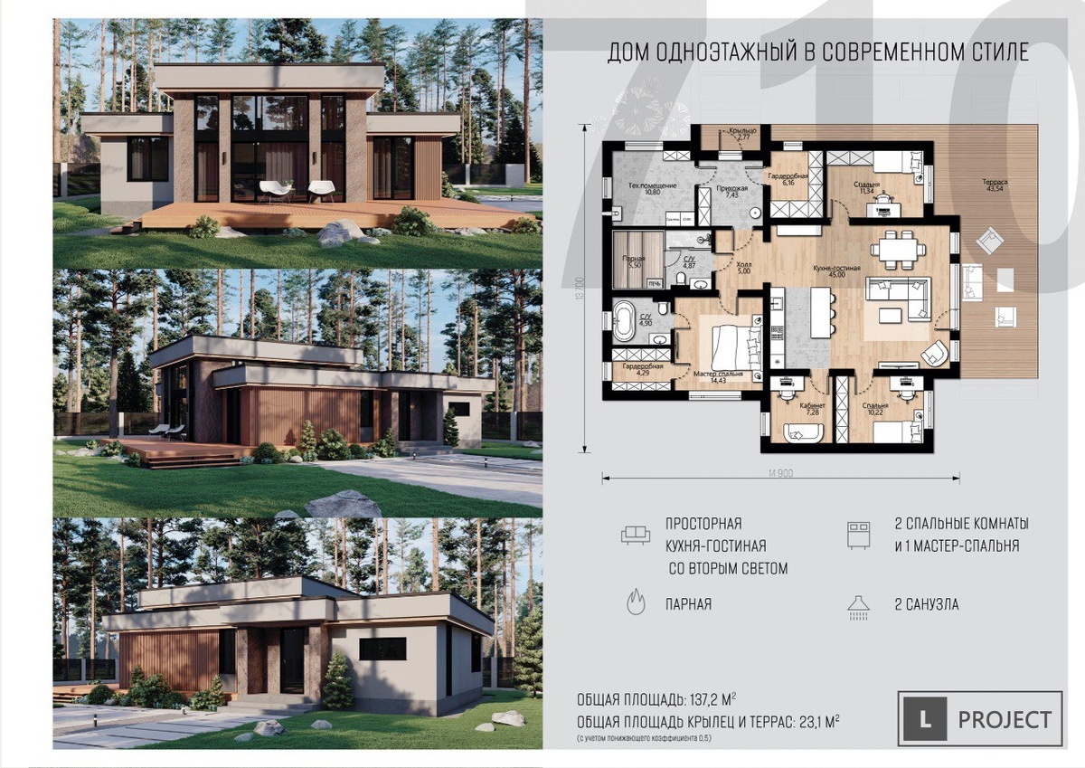 Проект разноуровневого хайтека В доме есть четыре спальные комнаты: одна из которых мастер-спальня, широкая финская сауна и просторная двухсветная гостиная с большим витражом. Для освещения зоны кухни-гостиной так же есть дополнительные узкие длинные окна под потолком с трех сторон 🩵