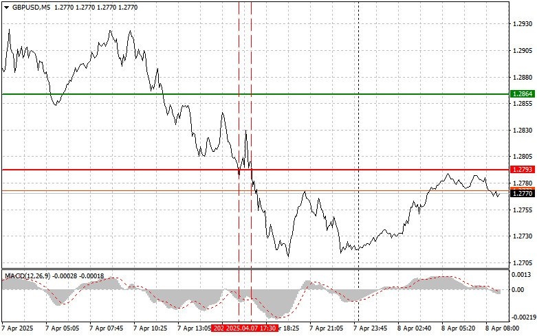 Тест цены 1.2793 пришелся на момент, когда индикатор MACD много прошел вниз от нулевой отметки, что ограничивало нисходящий потенциал пары. Второй тест 1.2793 в момент нахождения MACD в области перепроданности позволил реализоваться сценарию №2 на покупку. Однако по сделке были зафиксированы убытки, так как в итоге роста фунта, так и не произошло.