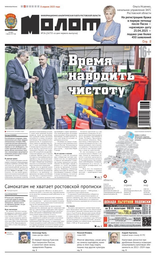 📰Эксклюзивные материалы свежего номера газеты «Молот»: Недоступная картошка Вице-спикер Госдумы Борис Чернышов обратился к министру экономического развития Максиму Решетникову с просьбой рассмотреть возможность введения временного ограничения цен на картофель. Ирина Варламова поговорила с донскими фермерами и выяснила, почему картофель подорожал и когда подешевеет. Море креветок За последние 10 лет величина доступного для освоения российскими промысловиками запаса креветок в Азовском море выросла в 30 раз. Когда они появятся на донских прилавках, читайте у Елены Бондаренко. По России со своим караваном Анастасия Стадникова развивает на юге России караванинг. В двухколесный прицеп помещаются мини-шкаф, спальное место для двоих и мини-кухня. Подробности о необычном хобби ростовчан разузнала Людмила Дьяченко. Также в номере: политическая рубрика «Акценты» и новости спорта. ✔️Читайте «Молот», у нас надежные источники! Оформляйте подписку во всех отделениях Почты России, а также на са