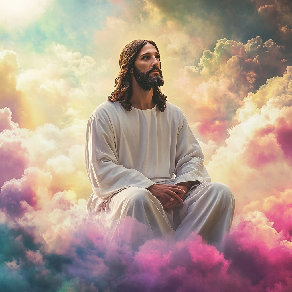 Создано на основе запроса: jesus christ sitting in clouds looking straight ahead hyper realism, colorful, realistic, abstract 4k