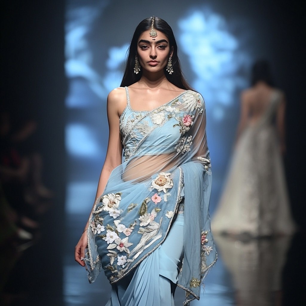 Создано на основе запроса: an Indian model walking on the ramp wears a pastel blue coloured saree and a white big flowered thread embroidery on it, the embroidery is sparkling on the reflection of light and the model is looking Devi beautiful and the saree is looking dreamily awesome on her
