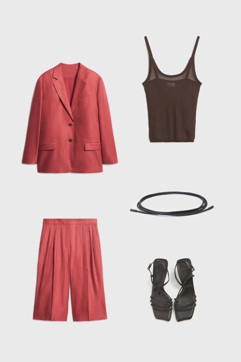 Идея сочетания цветов для базового гардероба на лето от стилистов LIMÉ: насыщенный бордовый + глубокий шоколадный. Образ 1: льняной костюм с блейзером и бермудами, полупрозрачный топ из хлопкового трикотажа, босоножки на фигурном каблуке и плетеный ремень-пояс; Образ 2: топ и юбка макси из рами, кожаные босоножки на небольшом каблуке и мини-сумка на длинном ремешке; Образ 3: укороченные джинсы с низкой посадкой, поло прямого кроя, замшевые кеды с меховыми вставками, подвеска-рыбка и покрытые золотом серьги из смолы; Образ 4: широкие брюки из атласа, рубашка прямого кроя из рами, базовый топ из хлопкового трикотажа и кожаные босоножки на высоком каблуке. #lime_match