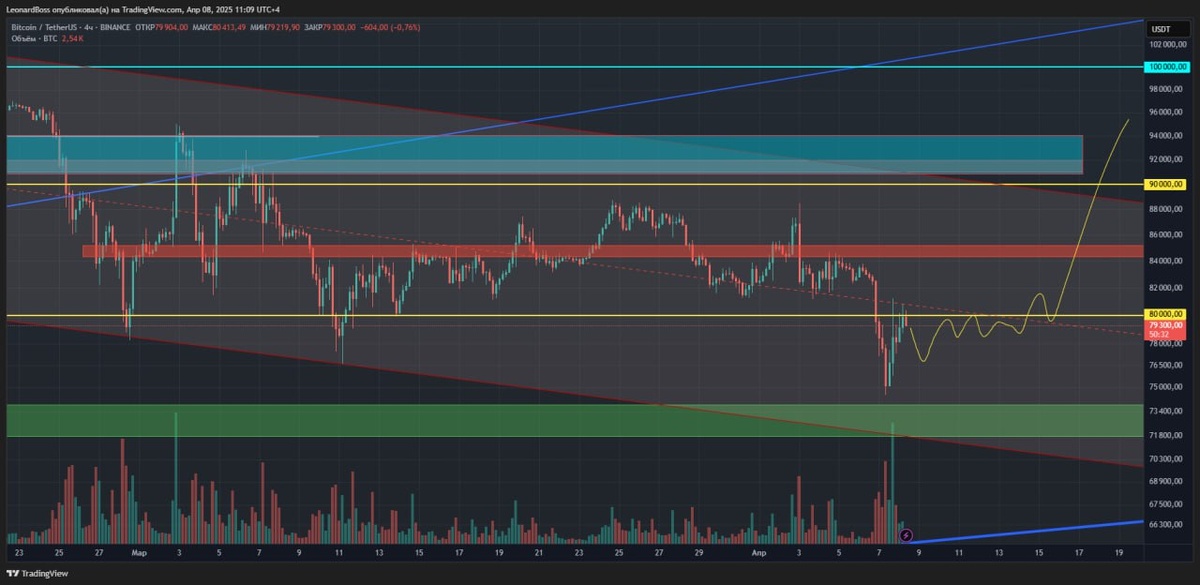 ⚠️Во-первых, обратите внимание, как четко отработал тот самый диапазон боковика с нижней границей 80К. Стоило 4Н свече закрыться ниже уровня и падение сразу ускорилось, добавив еще 7% снижения, при этом так и не протестировав сам блок поддержки!!