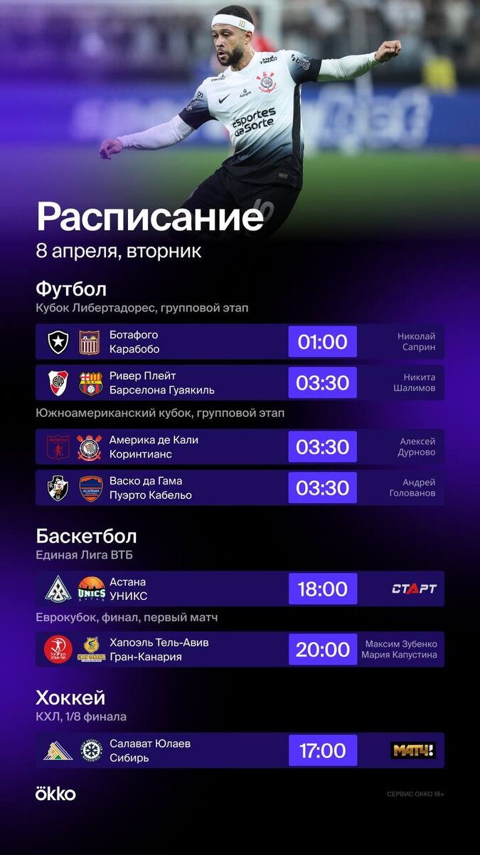 Не только ЛЧ едины. Сегодня будет еще много чего интересного 🔥 Перед четвертьфиналами посмотрим баскет и седьмой матч «Салавата» и «Сибири» в Кубке Гагарина. А после Лиги чемпионов отправимся за футболом в Южную Америку. Отличный план. Как всегда в Okko. Будем ждать здесь: https://okko.tv/s/4ot 😄