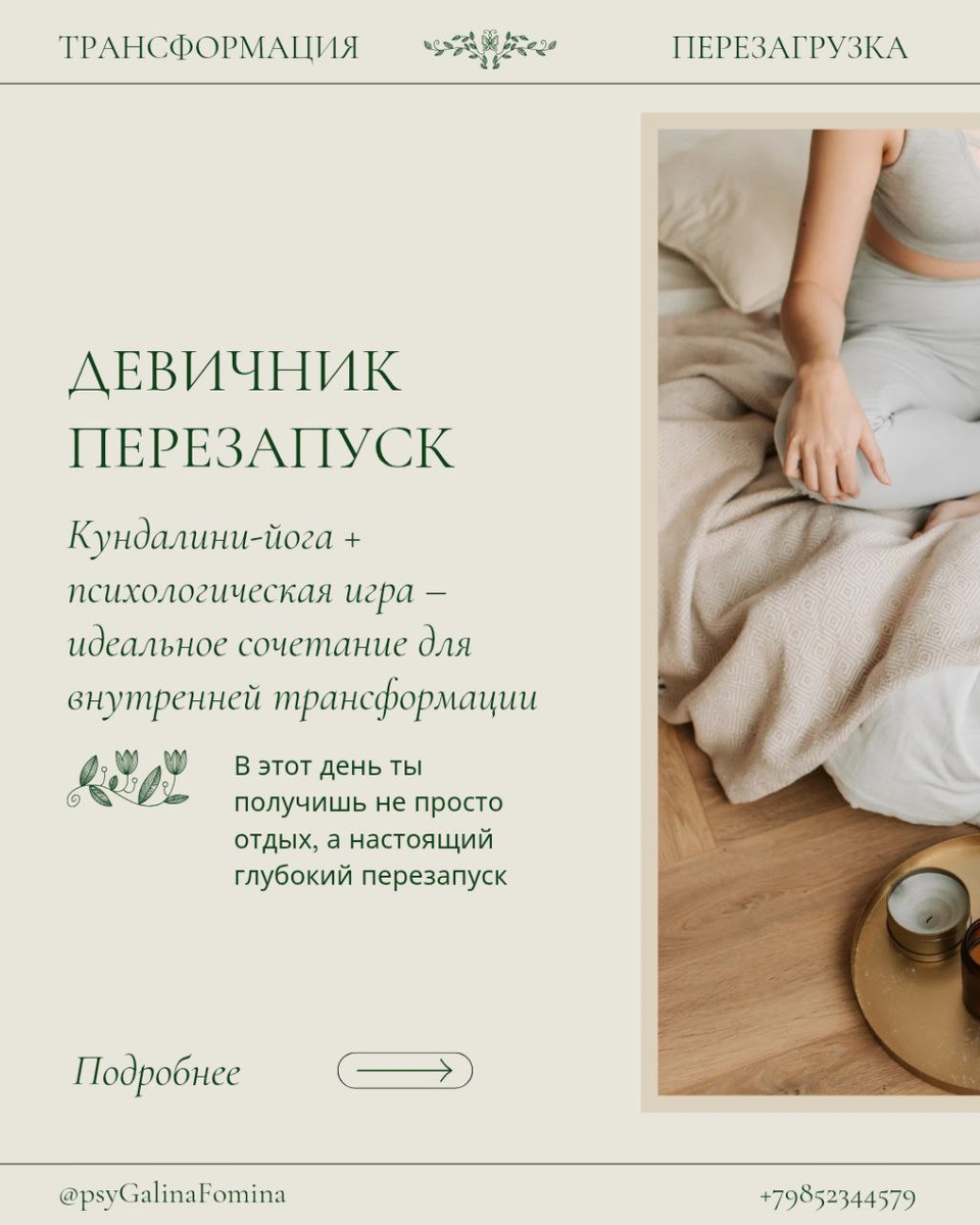 ❗️Сделай же хоть что-нибудь только для себя! ✨️Чтобы стать открытой к изменениям и воплощать свои мечты в реальность, нужно начать предпринимать конкретные шаги 🍀Например, присоединиться к нашему девичнику, окунуться в атмосферу женской поддержки и принятия, открыть внутри себя новые горизонты и двинуться в новый увлекательный путь к себе новой и настоящей, свободной и немного дикой! 💫 Кундалини-йога + психологическая игра – идеальное сочетание для внутренней трансформации 📌Проведите один день в нашей компании в программе нашего девичника и изменения не заставят себя ждать! ▪️В этот день ты получишь не просто отдых, а настоящий глубокий перезапуск 📍 Дата: 13 апреля 2025 года 💰 Стоимость: сейчас всего 4999₽ вместо 7999₽ ✔️Мы начнём с практик, направленных на восстановление эмоционального и ментального баланса. Затем перейдём к пробуждению внутренней силы, и уже в итоге придём к обновлению и заряду энергии на новый этап жизни 🪷Завершим этот день расслабляющей йога-нидрой, г