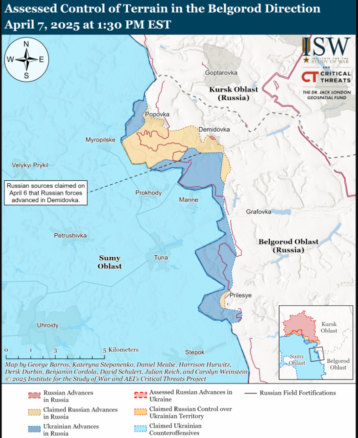 Согласно украинским сообщениям, ВСУ заняли около 13 кв. км территории в районе Демидовки. Зеленский одобрил действия ВСУ, подчеркнув, что «война должна вернуться туда, откуда она пришла». Президент Украины Владимир Зеленский впервые признал, что вооруженные силы Украины (ВСУ) удерживают позиции не только в части Курской области России, но и в соседней Белгородской области. «Мы проводим активные операции в приграничных районах на территории врага», - заявил глава государства в вечернем видеообращении, распространенном в Киеве в понедельник, 7 апреля. «Война должна вернуться туда, откуда она пришла», - добавил он. Со стороны России официальных подтверждений вторжения украинских войск в Белгородскую область нет, но местные власти частично утратили контроль над ситуацией после обстрелов приграничных территорий со стороны Украины. ... Всё это не нормально. И лишний раз показывает и говорит, что ВСЁ ЭТО нужно заканчивать... Люди при длительной такой ситуации теряют человеческий облик и каче