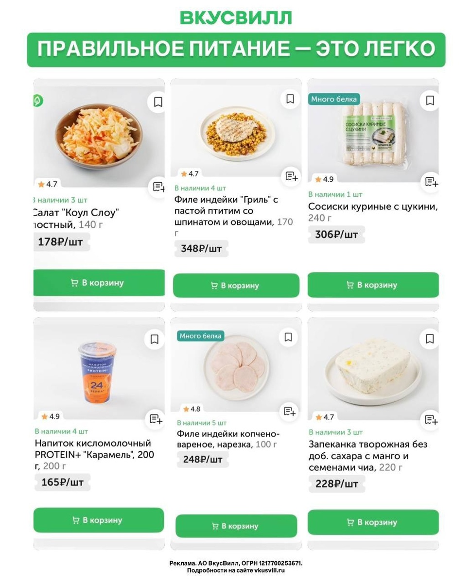 💚 СКИДКИ ВО ВКУСВИЛЛ 💚 Лето уже близко, а вы еще не готовы? Решение есть у ВкусВилла! Проверяйте наличие на сайте или в приложении: • Запеканка творожная без доб. сахара с манго и семенами чиа • Филе индейки копчено-вареное, нарезка • Напиток кисломолочный PROTEIN+ «Карамель» • Сосиски куриные с цукини • Филе индейки «Гриль» с пастой птитим со шпинатом и овощами • Салат «Коул Слоу» Промокоды на первый онлайн-заказ: ✅ VSCB781 — скидка 250 ₽ от 1250 ₽ ✅ 30V9EF2 — скидка 300 ₽ от 1500 ₽ ✅ 35VD4AF — скидка 350 ₽ от 2500 ₽ Реклама. АО ВкусВилл, ОГРН 1217700253671. Подробности на сайте vkusvill.ru erid: 2VtzqwCdDY5