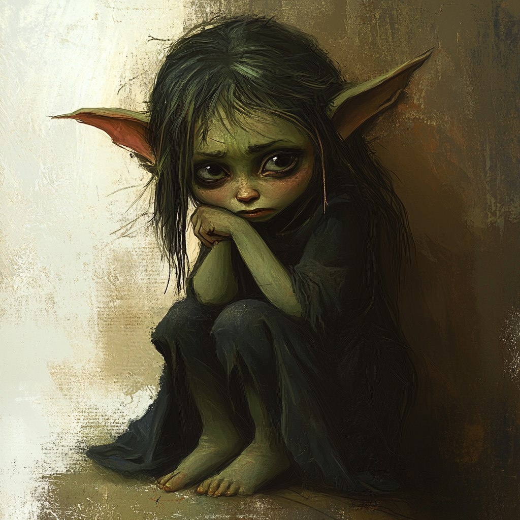 Создано на основе запроса: fantasy art of sad female goblin child, [digital painting in the style of Frank Frazetta