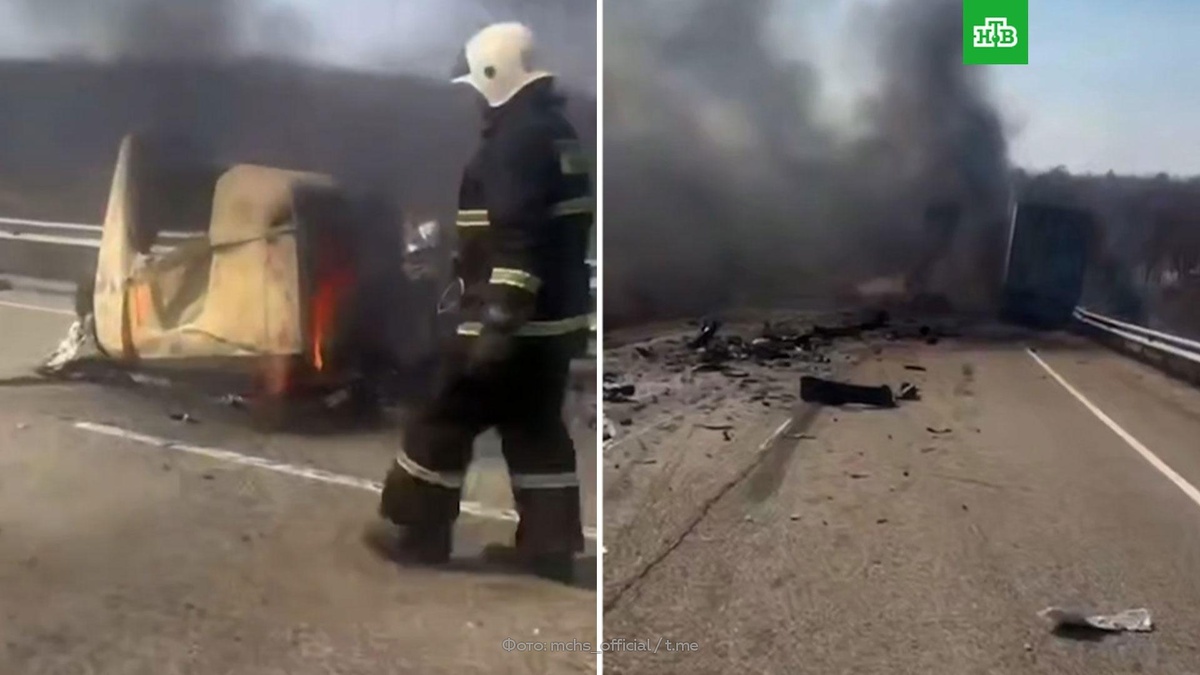 [ Смотреть видео на сайте НТВ ] Два человека погибли при столкновении двух грузовиков на федеральной трассе «Благовещенск-Свободный». Как сообщили в ГАИ региона, автокатастрофа произошла на 123-м километре трассы «Благовещенск — Свободный». Там лоб в лоб столкнулись два тягача, один из которых от удара загорелся. Водители грузовиков погибли. В соцсетях появились кадры с места ДТП. На них видно, что после столкновения на проезжую часть и обочину вылетели детали грузовиков, в том числе двигатель. [ Смотреть видео на сайте НТВ ]