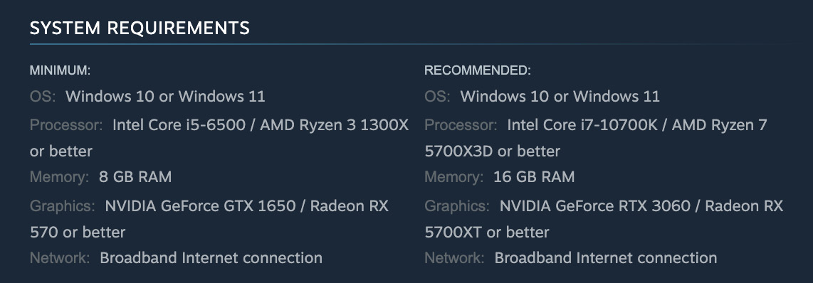 Системные требования F2P шутера Mecha Break демонстрируют, что игра сможет запускаться даже на устаревших и бюджетных игровых ПК. Несмотря на динамичный геймплей и высокий уровень детализации, разработчики заявляют о хорошей оптимизации, что подтверждается первыми отзывами сообщества. Тестирование показало, что игра отлично работает даже на видеокартах нижнего ценового сегмента. Минимальные требования Mecha Break действительно скромные: видеокарта Nvidia GeForce GTX 1650 или AMD Radeon RX 570, процессор Intel Core i5 6500 или AMD Ryzen 3 1300X, и всего 8 ГБ оперативной памяти. Такая конфигурация, вероятно, обеспечит игру с частотой 30 кадров в секунду при разрешении 720p, хотя официальных показателей производительности пока не объявлено. Рекомендуемые спецификации делают заметный скачок вверх, но все еще остаются в пределах досягаемости для среднебюджетных игровых сборок. Здесь требуется Nvidia GeForce RTX 3060 или AMD Radeon RX 5700 XT в паре с Intel Core i7 10700K или AMD Ryzen 7 570