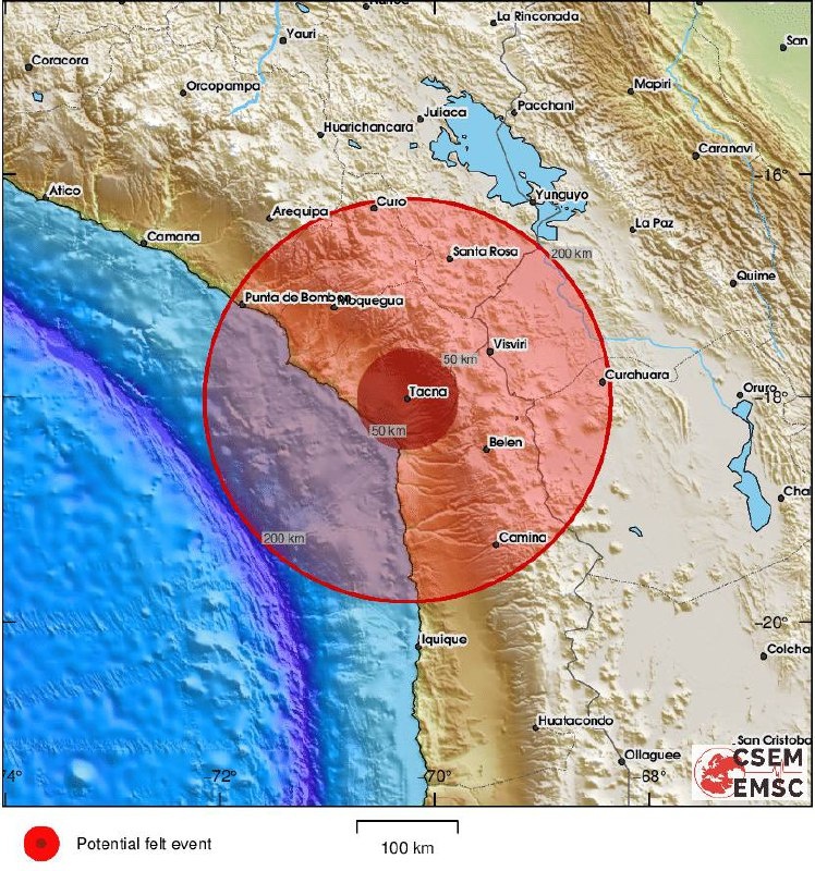 A 4.2 magnitude earthquake has struck 40 km from Camaná, Arequipa, Peru Preliminary data indicating a magnitude of 4.6 — located 28 km east of Ilabaya