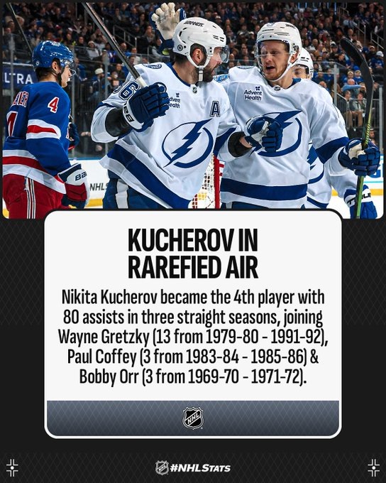Никита Кучеров продолжает неистовую борьбу за «Арт Росс Трофи», снова догнав Нэтана Маккиннона в таблице лучших бомбардиров этого сезона НХЛ. Понедельничный матч против «Рейнджерс» российский нападающий «Тампы» начал с забитого гола в ворота Игоря Шестеркина. Видео смотрите в ТГ-канале «Голы с подсказом: наши в НХЛ». И подписывайтесь! Таким образом Кучеров в третьем подряд сезоне покорил высоту в 80 голевых ассистов, что за всю историю лиги сумели сделать только Уэйн Гретцки, Пол Коффи и Бобби Орр. Американские поклонники хоккея следующим образом отреагировали на очередное статистическое свершение россиянина. @Thewonderwoood:– В сравнении с временами Гретцки, Орра и Коффи хоккей сейчас совершенно другой, так что это достижение Кучерова выглядит еще более впечатляющим. @brian_arbeloa:– Если бы Куч был канадцем, то его третий подряд сезон с 80 ассистами оказался на обложках всех национальных СМИ. @Italynstallyin:– В отличие от Овечкина, Кучеров совершенно неэгоистичный игрок – отсюда и т
