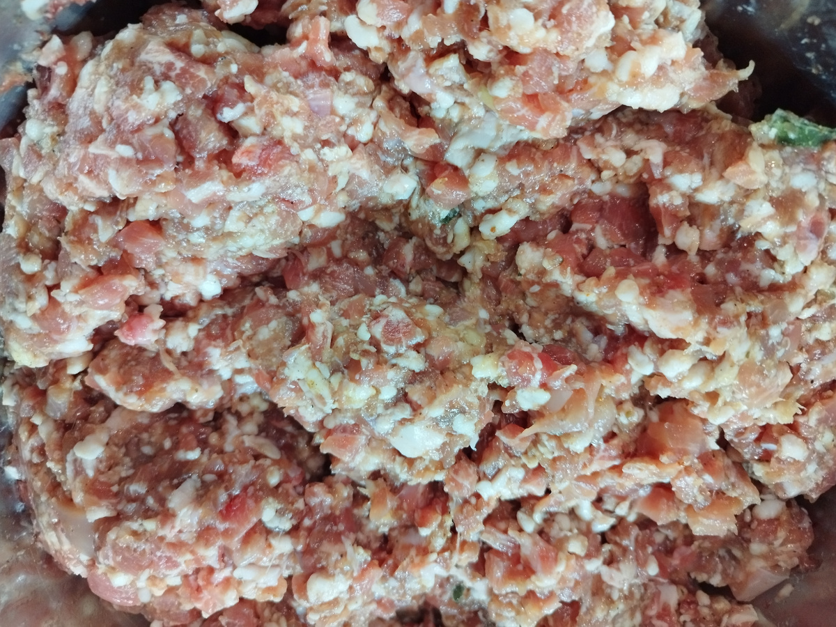 Мясо. Смешайте нарезанное мясо и специи. Добавьте воду и тщательно перемешайте. Оставьте мариноваться в холодильнике на несколько часов или на ночь. Подготовка оболочки: Замочите кишечную оболочку в теплой воде на 30 минут. Затем промойте её изнутри под проточной водой. Приступайте к да