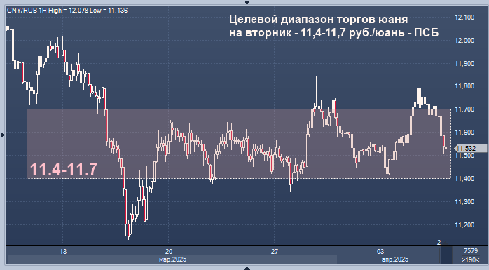 Целевой диапазон торгов юаня на вторник - 11,4-11,7 руб./юань - ПСБ Курс доллара к рублю расчётный, фьючерс, вечный фьючерс и межбанк. Курс евро к рублю расчётный, фьючерс, вечный фьючерс и межбанк. Курс юаня к рублю биржевой, фьючерс, вечный фьючерс и межбанк. Целевой диапазон на вторник для юаня составляет 11,4-11,7 рубля за юань, считает начальник отдела экономического и отраслевого анализа банка ПСБ Евгений Локтюхов. "Курс юаня начал неделю снижением к 11,6 руб. - утренние попытки развить рост в направлении 12 руб. оказались неудачными ввиду вечернего улучшения настроений на мировых фондовых и товарных рынках, ослабивший спрос на валюты, - отмечает эксперт в комментарии. - Определенную поддержку рублю, видимо, оказало и увеличение Банком России продаж юаней с 6 до 10,5 млрд руб. в сутки, вчера дополнительно увеличенные, видимо, ввиду пятничных праздников в КНР (в пятницу регулятор продаж не осуществлял)". Аналитик ждет во вторник сохранения инерционного давления на курсы валют, на