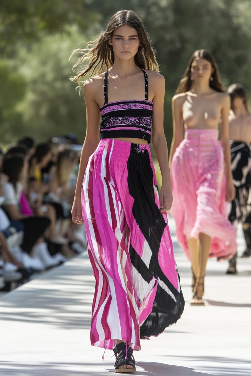 Создано на основе запроса: outside summer fashion show, 5 models, very real-looking, colours of pink, black, and white, summer clothes