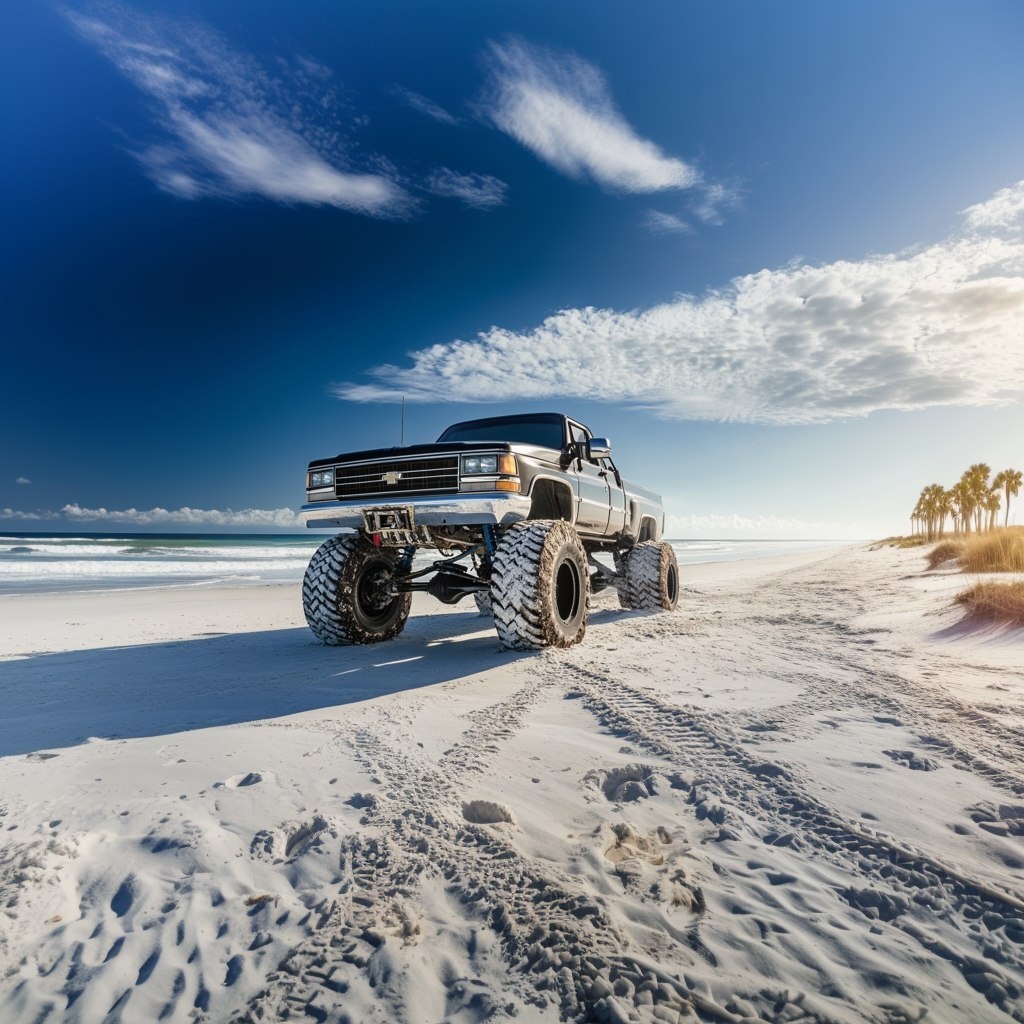 Создано на основе запроса: a lifted truck with big mud tires, on a big white sand beach, perfect waves peal across the background