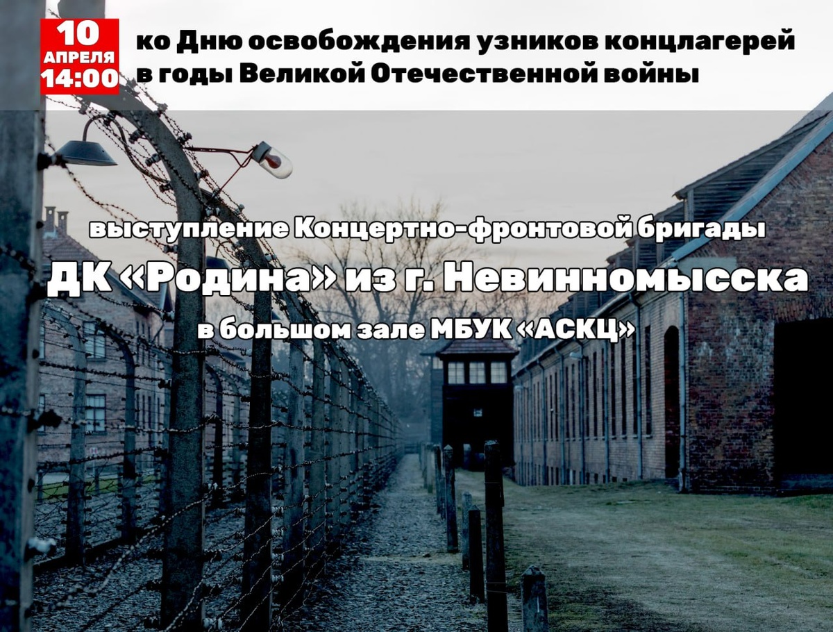 10 апреля в 14:00 в БЗ МБУК «АСКЦ» с. Курсавка, ко Дню освобождения узников концлагерей в годы ВОв состоится выступление Концертно-фронтовой бригады ДК «Родина» из г. Невинномысска